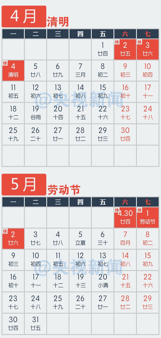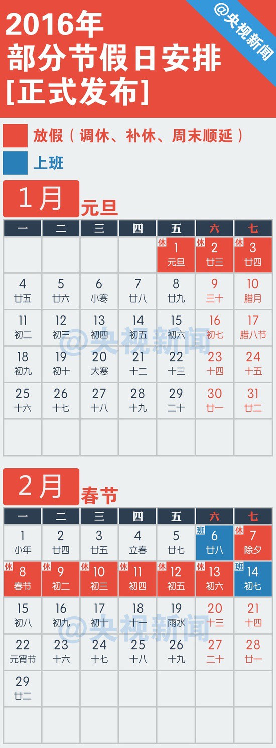 @央視新聞:【[話筒]擴(kuò)散:#2016放假安排公布# 最新!】①元旦1月1日放假 ②春節(jié):2月7日(除夕)-13日放假,2月6日、14日上班 ③清明:4月4日,連休3天 ④勞動節(jié):5月1日,連休3天 ⑤端午:6月9日-11日放假,12日上班 ⑥中秋:9月15日-17日放假,18日上班 ⑦國慶節(jié):10月1日-7日放假,10月8日、10月9日上班。