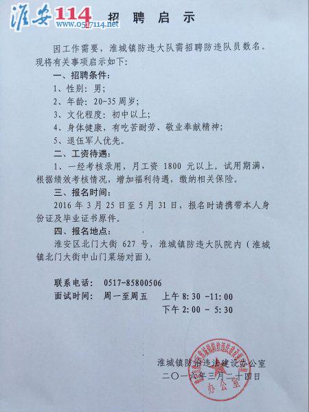 淮安區(qū)淮城鎮(zhèn)防違大隊(duì)招聘防違隊(duì)員數(shù)名相關(guān)圖片信息