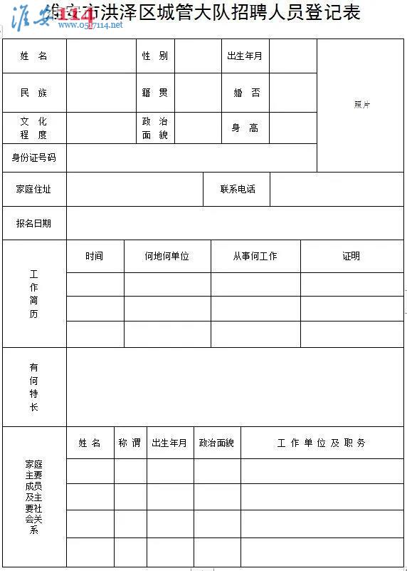 附:洪澤區(qū)城管大隊招聘人員信息登記表